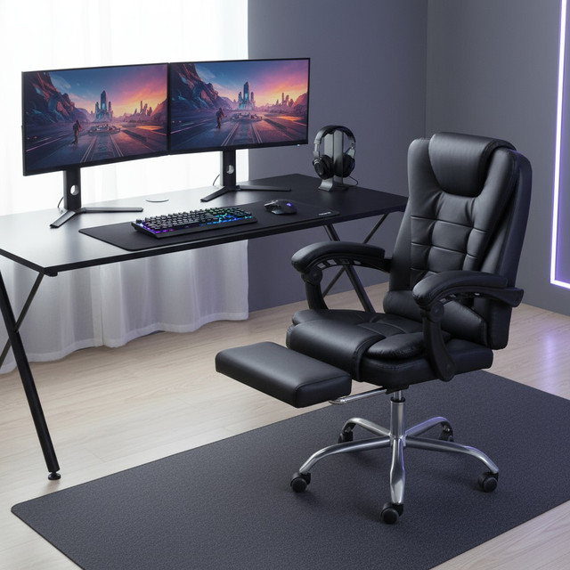 М'яке офісне крісло Primaveo з підніжкою із Еко-шкіри комп'ютерне обертове із підставкою для ніг для роботи навчання та відпочинку Чорний