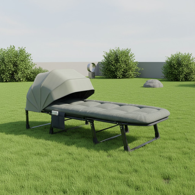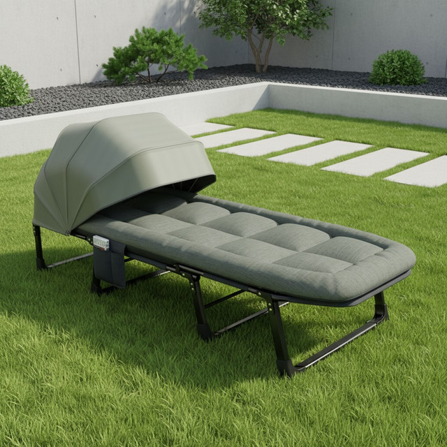 Розкладне ліжко‑шезлонг WCG FB‑S25 зі сталевим каркасом, м’яким матрацом і регульованим сонцезахисним навісом. Підходить для використання в саду, на терасі, біля басейну чи в кемпінгу.